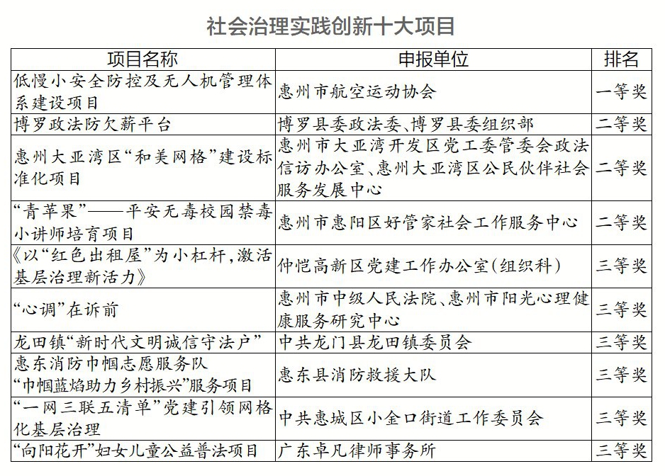 為全面貫徹黨的二十大精神,進(jìn)一步落實中央、省委深入推進(jìn)市域社會治理現(xiàn)代化工作部署和要求,努力培育市域社會治理實踐創(chuàng)新項目品牌和標(biāo)桿,加快推進(jìn)市域社會治理現(xiàn)代化試點工作,從今年6月開始,2023年惠州市共建共治共享市域社會治理實踐創(chuàng)新十大項目征選活動正式啟動。