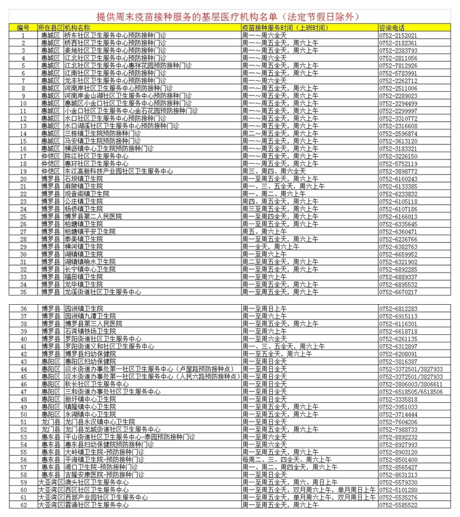那么,惠州情況如何?連日來,記者進(jìn)行了走訪。8月18日,記者從市衛(wèi)生健康局獲悉,目前全市有62家基層醫(yī)療機(jī)構(gòu)開展周末疫苗接種服務(wù)。