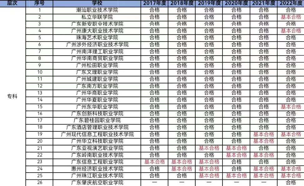 從表格可以看出,北京理工大學(xué)珠海學(xué)院、廣州珠江職業(yè)技術(shù)學(xué)院這2校連續(xù)4年都為“基本合格”;廣州現(xiàn)代信息工程職業(yè)技術(shù)學(xué)院、惠州經(jīng)濟職業(yè)技術(shù)學(xué)院這2校連續(xù)2年都為“基本合格”。