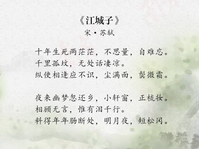 1065年,王弗病逝,年僅二十六歲。十年后,回首往事,蘇軾感慨萬(wàn)千,寫(xiě)下這首詞悼念亡妻。