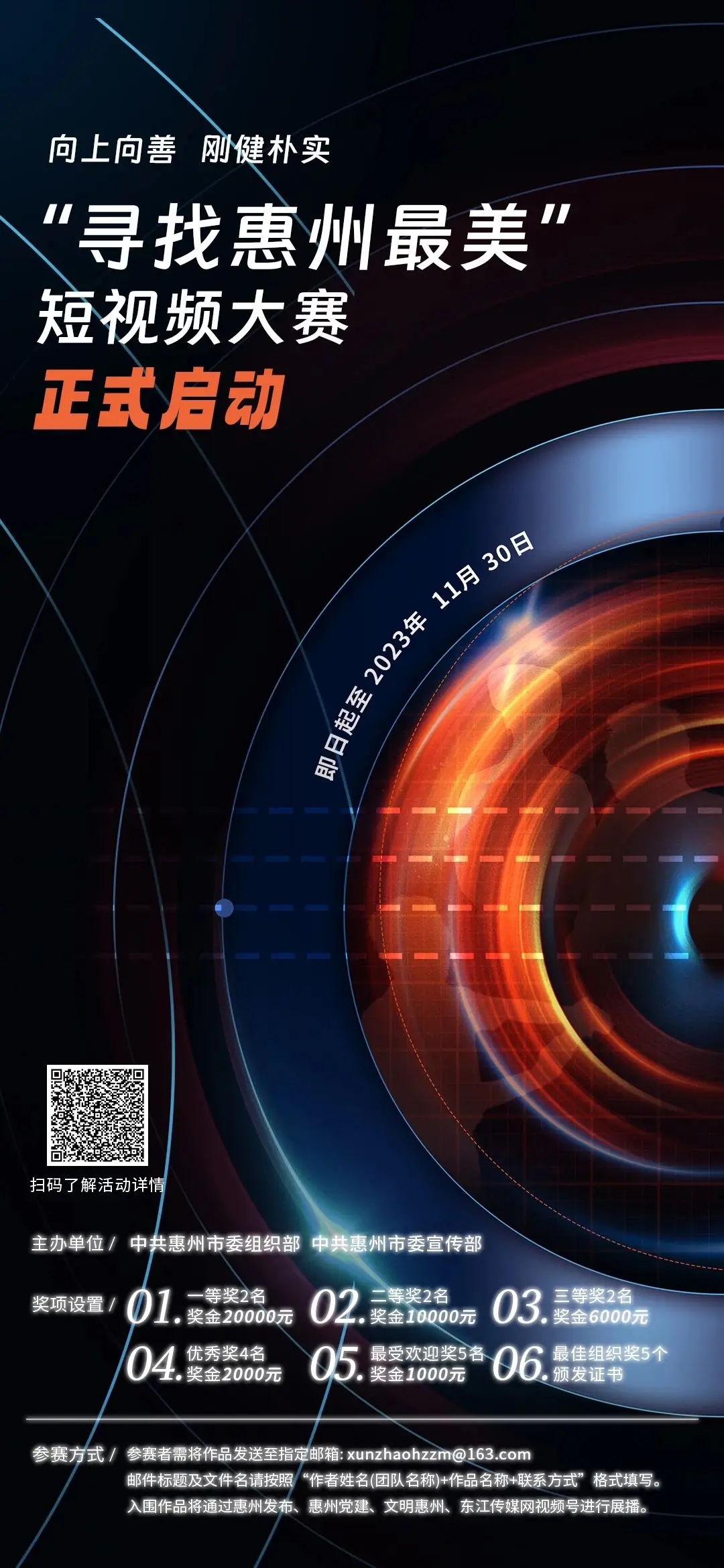 入圍作品將通過惠州發(fā)布、惠州黨建、文明惠州、東江傳媒網(wǎng)視頻號(hào)進(jìn)行展播。大賽將評(píng)選出一等獎(jiǎng)2名(獎(jiǎng)金各20000元)、二等獎(jiǎng)2名(獎(jiǎng)金各10000元)、三等獎(jiǎng)2名(獎(jiǎng)金各6000元)、優(yōu)秀獎(jiǎng)4名(獎(jiǎng)金各2000元)、最受歡迎獎(jiǎng)5名(獎(jiǎng)金各1000元)、最佳組織獎(jiǎng)5個(gè)(頒發(fā)證書)。