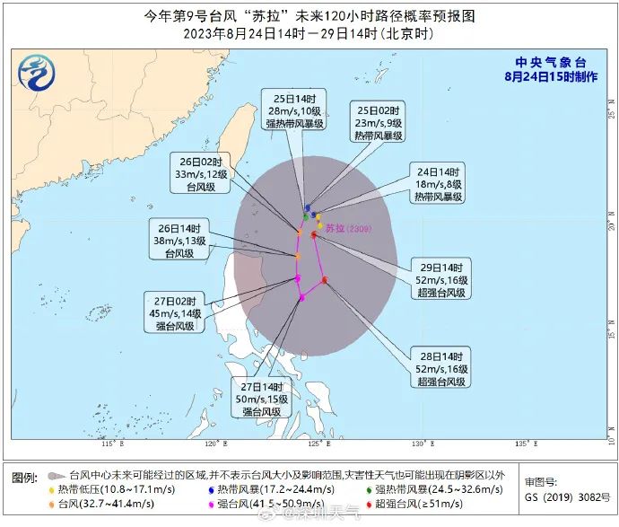 原位于菲律賓以東的西北太平洋洋面上的熱帶低壓已于24日14時(shí)加強(qiáng)為今年第9號(hào)臺(tái)風(fēng)“蘇拉”(熱帶風(fēng)暴級(jí),英文名:Saola,來(lái)源:越南,意義:一種動(dòng)物),其中心位于廣州市東南方向約1200公里,也就是北緯20.3度、東經(jīng)124.7度,中心附近最大風(fēng)力8級(jí)(18米/秒),中心最低氣壓998百帕。預(yù)計(jì),24-29日“蘇拉”路徑以原地回旋為主,強(qiáng)度逐漸加強(qiáng)。