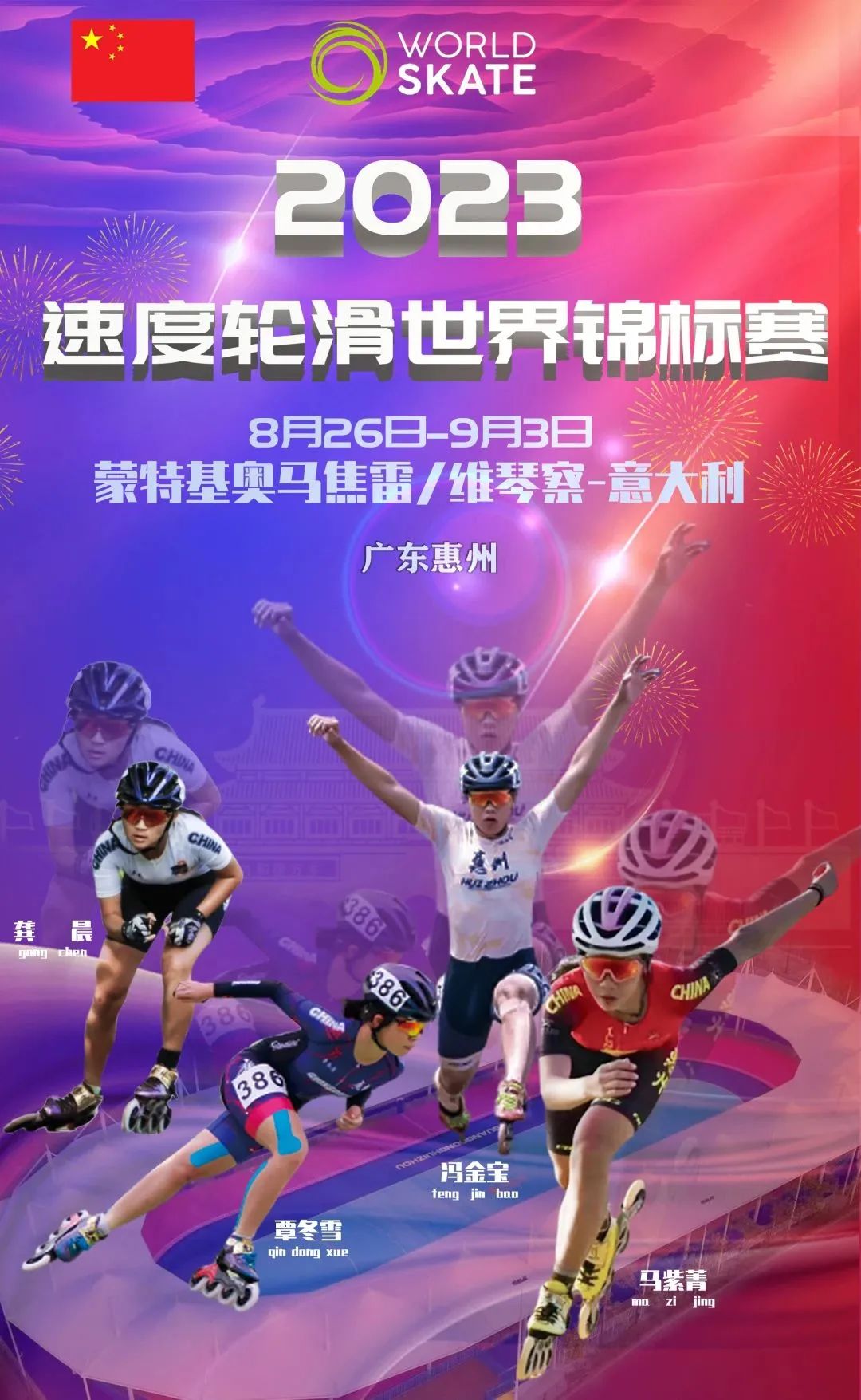 2023年速度輪滑世界錦標賽將于8月26日至9月3日在意大利舉辦,惠州市速度輪滑隊馮金寶、龔晨、馬紫菁、覃冬雪4名運動員經(jīng)過選拔,將代表中國參加此項國際比賽。他們已出發(fā)飛往意大利,這也是首次有惠州運動員亮相國際速度輪滑賽場。