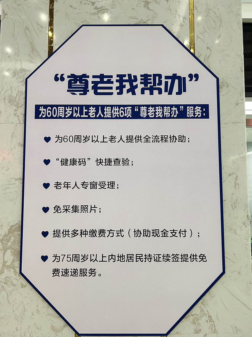 在惠州市政務(wù)服務(wù)中心三樓辦證大廳的顯眼位置懸掛著《尊老我?guī)娃k》便民信息。惠報全媒體記者嚴(yán)東東 攝