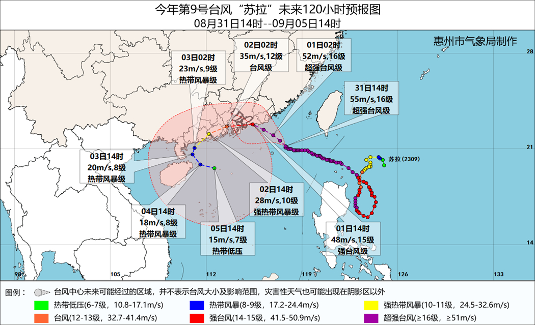 惠州市氣象臺8月31日16時40分發(fā)布:31日16時,今年第9號臺風(fēng)“蘇拉”(超強臺風(fēng)級)中心位于惠東港口東南方向約320公里的南海東北部海面上,中心附近最大風(fēng)力16級(55米/秒)。預(yù)計“蘇拉”將于9月1日下午至夜間在惠來到香港一帶沿海登陸(強臺風(fēng)級或超強臺風(fēng)級,14級~16級),或近海擦過折向西偏南方向。