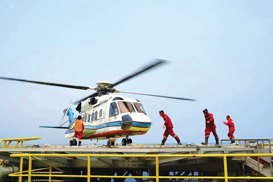 直升機(jī)將海上鉆井平臺人員撤離至陸地。惠州日報記者張宇琪 攝
