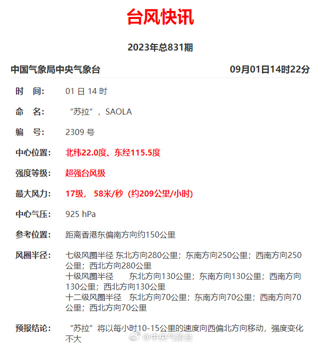 下午14時(shí),超強(qiáng)臺風(fēng)“蘇拉”中心附近最大風(fēng)力17級(58米/秒)。預(yù)計(jì),“蘇拉”將以每小時(shí)10~15公里的速度向西偏北轉(zhuǎn)偏西方向移動,將于今天夜間到明天上午以強(qiáng)臺風(fēng)級或超強(qiáng)臺風(fēng)級在廣東惠東到臺山一帶沿海登陸,也不排除在廣東中部近岸海面向西偏南方向移動的可能。