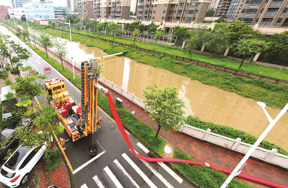 9月2日上午,惠城區(qū)水口街道惠富路附近出現(xiàn)一定程度的內(nèi)澇,惠州市水務(wù)集團排水中心出動1臺“龍吸水”大型排澇設(shè)備協(xié)助當(dāng)?shù)嘏潘T撆潘行膽?yīng)急隊隊長胡洪介紹,中心應(yīng)急排澇救援使用的“龍吸水”共有3臺,其中1臺抽水量可達每小時1000立方米,2臺抽水量可達每小時3000立方米。