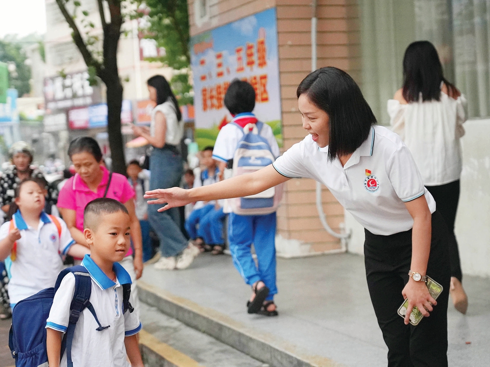 博羅縣羅陽第四小學的學生開開心心走進校園,老師在門口熱情迎接。