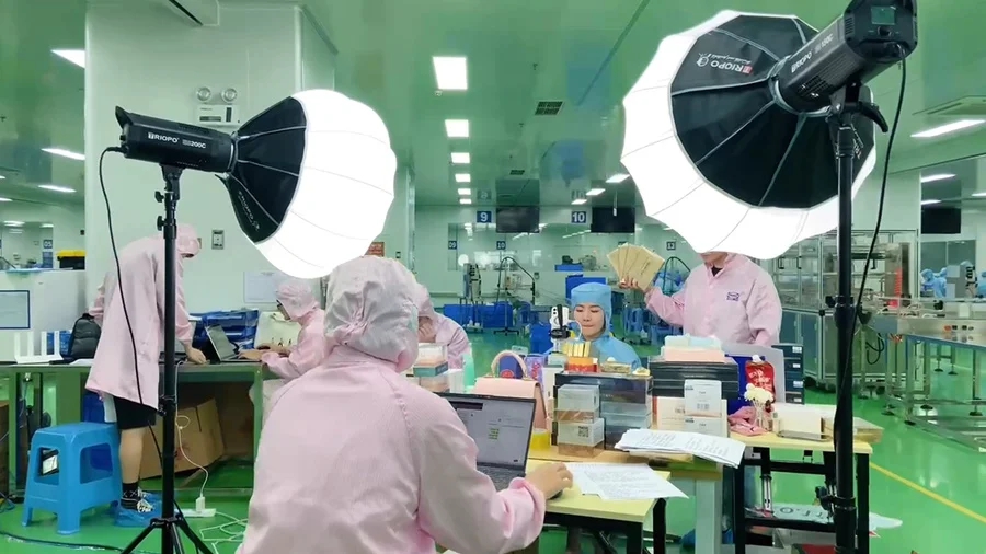 生產(chǎn)車(chē)間內(nèi)彭氏員工在直播帶貨。