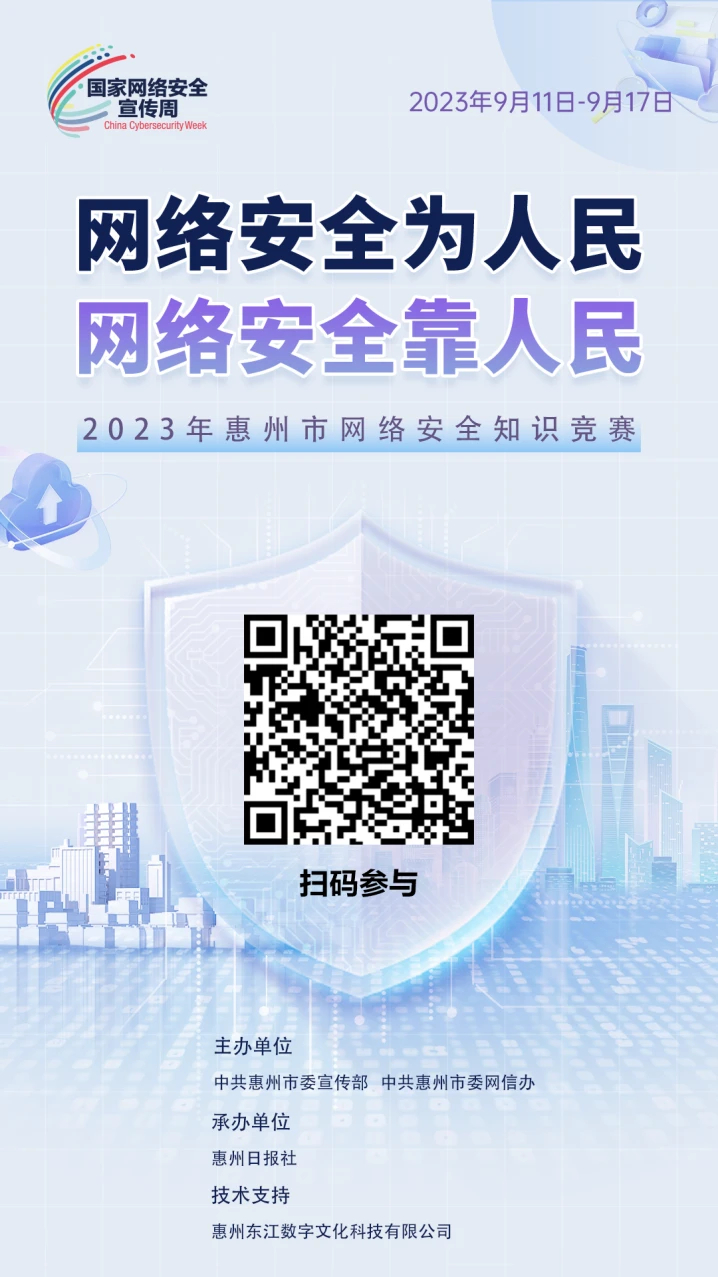 9月12日,記者從市委網(wǎng)信辦獲悉,2023年惠州市網(wǎng)絡(luò)安全知識競賽正式啟動。本次比賽持續(xù)至17日,參與答題即有機會獲精美禮品,廣大市民網(wǎng)友可掃描圖片二維碼積極參與。