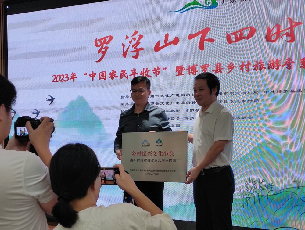全省首個(gè)鄉(xiāng)村振興文化小院落戶惠州,吳志才(右)為博羅浮生六季生態(tài)園授牌。