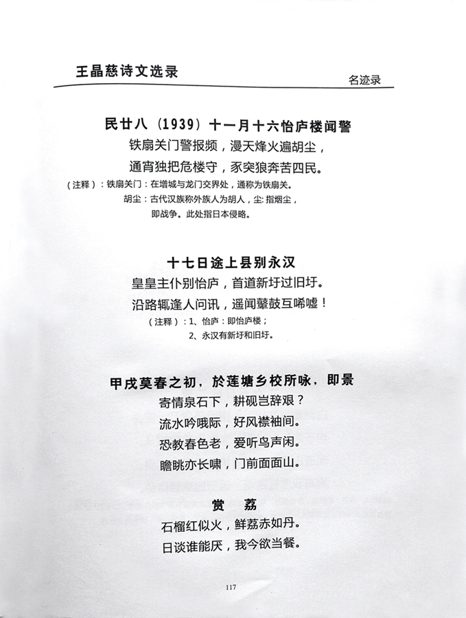 當時,王晶慈以詩歌言“家國情懷”,寫下流離顛沛的“詩史”。在《民廿八十一月十六怡廬樓聞警》,他寫道“鐵扇關(guān)門警報頻,漫天烽火遍胡塵,通宵獨把危樓守,豕突狼奔苦四民”。鐵扇關(guān)門在增城與龍門交界處,怡廬樓為王晶慈在永漢圩住所。在次日的詩歌《十七日途上縣別永漢》中,他寫道“倉皇主仆別怡廬,首道新圩過舊圩。沿路輒逢人問訊,遙聞鼙鼓互唏噓”。隨后,在《二十日詠于縣城邸》詩中,驚魂未定的王晶慈說,“鄉(xiāng)云籠罩戰(zhàn)云中,頻見飛機屢襲空。骨肉流離蓮梗斷,七星岡里叩蒼穹。”
