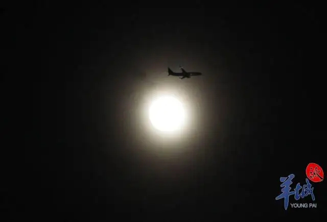 資料圖:月亮透過朦朧云層出現(xiàn)在廣州夜空,一架民航客機(jī)恰好經(jīng)過。羊城晚報(bào)全媒體記者 梁懌韜 攝