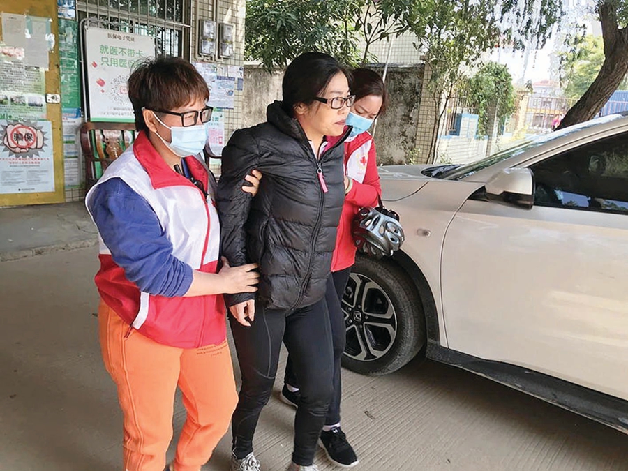 鄺彩紅(左一)在幫助行動不便的市民。