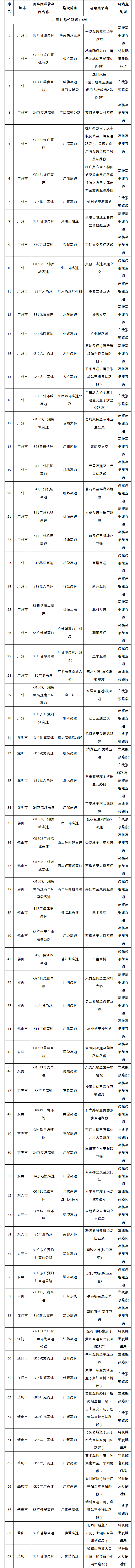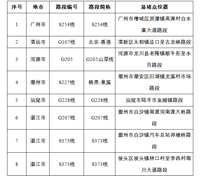 預(yù)計(jì)繁忙路段一覽表