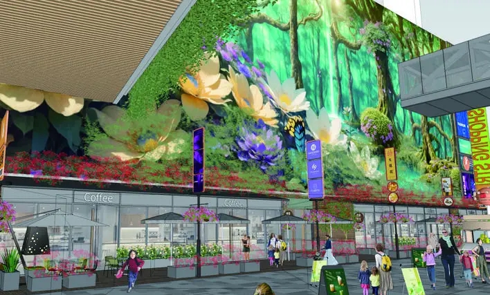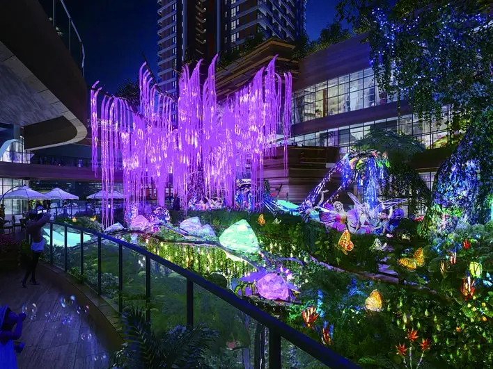 “兩街”以羅浮山文化為緣起,融合葛洪遺衣化蝶的故事,通過文化演繹、IP詮釋、綠化造景、聲光電場(chǎng)景及多媒體交互體驗(yàn)的應(yīng)用,打造情景式主題街區(qū)“蝶樹溪谷”及特色商業(yè)街“羅浮里街”,讓歷史傳說劃時(shí)空而來,造就現(xiàn)代的精彩。與此同時(shí),街區(qū)內(nèi)品牌旗艦店、特色酒吧、休閑餐飲、主題花車等業(yè)態(tài)與“兩街”場(chǎng)景相得益彰,加上潮流文化演繹中心廣場(chǎng)、購(gòu)物中心戶外IP光影劇場(chǎng)、戶外裸眼3D大屏等,斑斕多姿的生活方式將在“羅浮里”一一上演。以夜空為幕,透過光影劇場(chǎng)及多媒體交互場(chǎng)景,觀眾可隨時(shí)體驗(yàn)一場(chǎng)視覺奇幻之旅。