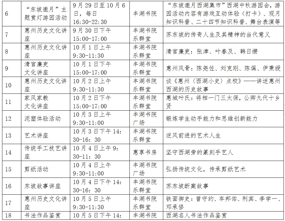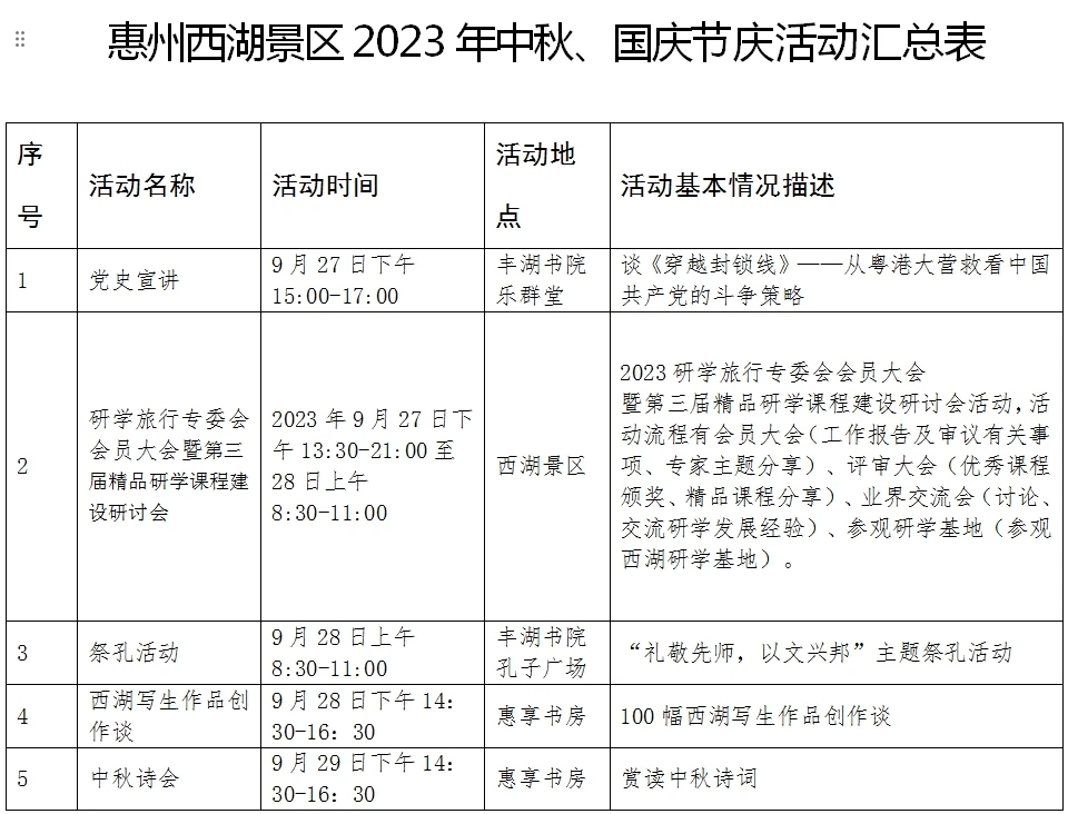 中秋、國慶即將來臨,惠州日報記者從惠州西湖景區(qū)管理中心獲悉,西湖景區(qū)在中秋、國慶節(jié)期間,將舉辦多種形式的活動,包括黨史宣講、精品研學(xué)課程建設(shè)研討會、祭孔活動、寫生作品創(chuàng)作談、中秋詩會、賞燈游園活動、各類講座、剪紙活動、古箏演奏等等。歡迎感興趣的市民群眾前往參加。