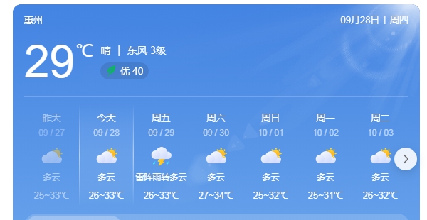 惠州日報訊 (記者劉建威)據(jù)市氣象臺9月27日15時發(fā)布,預(yù)計中秋國慶假期我市天氣總體平穩(wěn),無臺風(fēng)直接影響和大范圍強(qiáng)降水,方便出游。假期前期(9月29日~10月1日)多云為主,局部有雷陣雨,其中中秋夜可見月光;假期中期(10月2日~3日)多云有雷陣雨;假期后期(10月4日~6日)多云到晴為主。