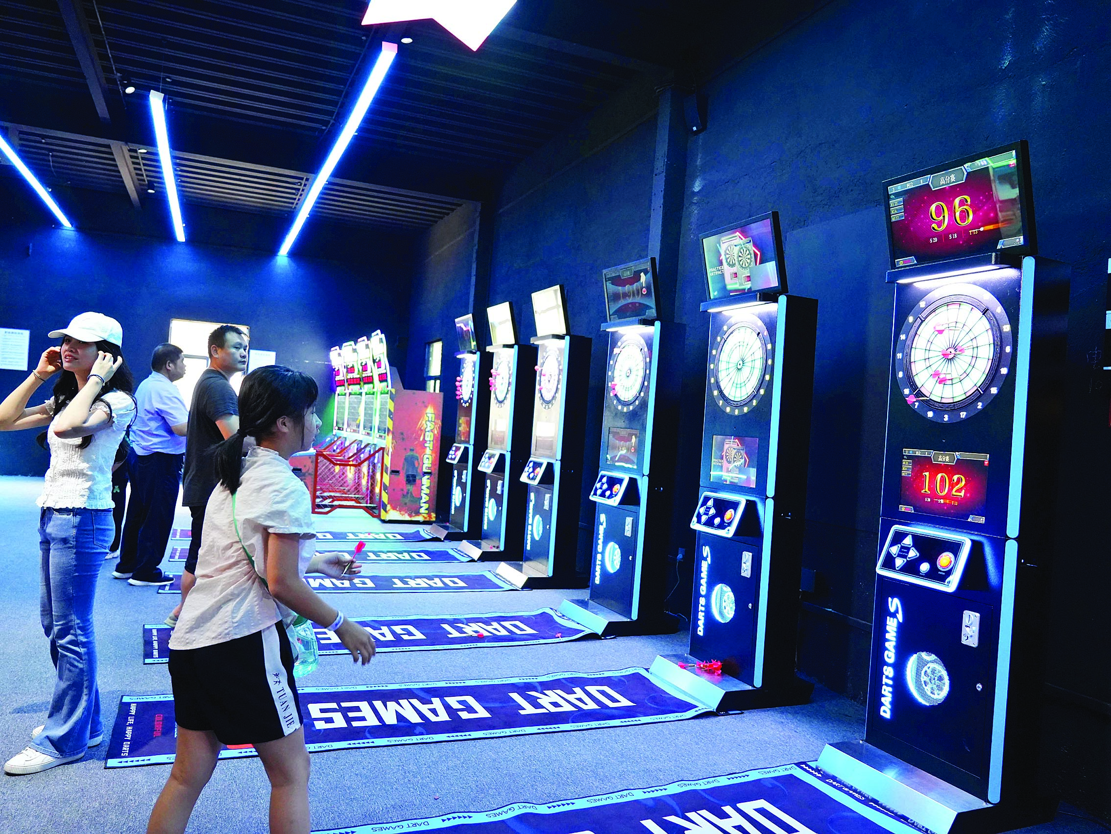 “瞄準(zhǔn),發(fā)射!”記者看到,不少青年朋友在飛鏢區(qū)玩“PK大賽”,他們紛紛手持飛鏢、對準(zhǔn)靶盤投擲,分高者勝。飛鏢區(qū)共有10臺電腦智慧飛鏢機,是最新技術(shù)的聯(lián)網(wǎng)多機版,可直接發(fā)起或參與全國范圍的多地聯(lián)賽,能一次性滿足10個人同時體驗。
