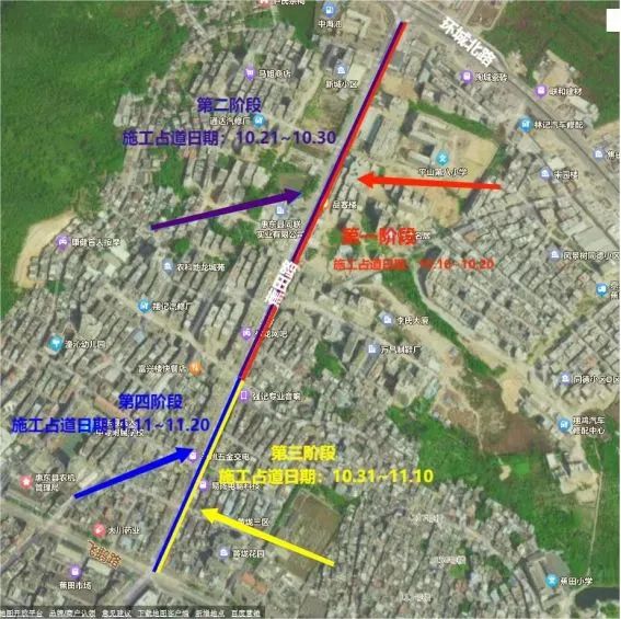 因惠東縣城三聯(lián)生活污水處理廠及蕉田至三聯(lián)片區(qū)配套管網(wǎng)建設(shè)工程項(xiàng)目建設(shè)需要,需占用蕉田大道(環(huán)城北路交匯處至飛鵝路交匯處)約1100米處的機(jī)動(dòng)車道路路面進(jìn)行占道圍蔽施工,為了減小對(duì)交通影響和保障施工及交通安全,擬定分開四個(gè)階段占道圍蔽施工,