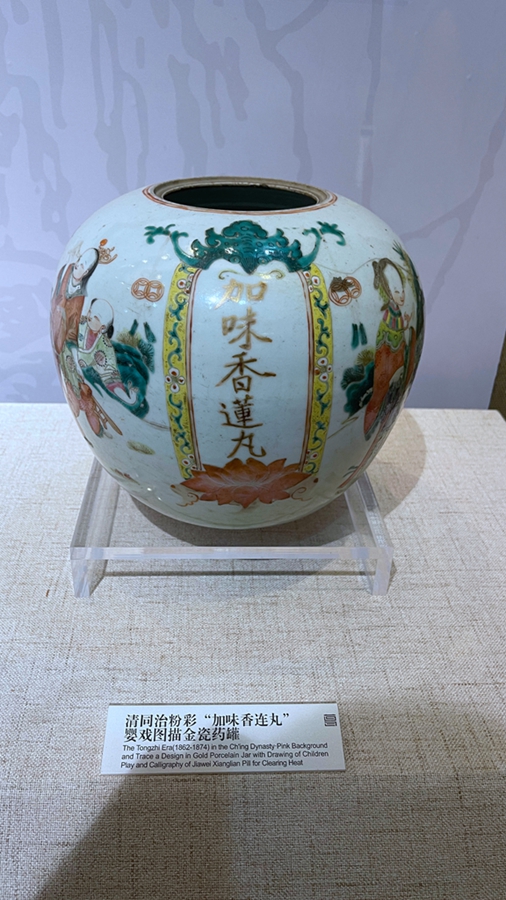 清同治粉彩“加味香連丸”嬰戲圖描金瓷藥罐。