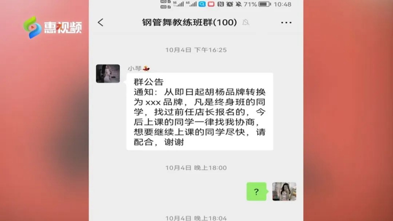 林女士說,自己交了8000元后,一直正常上課。10月4日,胡楊舞蹈陳江店微信群里一位黃姓女士發(fā)布公告:即日起胡楊品牌轉(zhuǎn)換,凡是終身班的同學(xué),找過前任店長報(bào)名的,今后上課一律找我協(xié)商,想要繼續(xù)上課的同學(xué)盡快,請(qǐng)配合。公告發(fā)布后,胡楊舞蹈陳江店就關(guān)門停業(yè)了。10月9日上午10點(diǎn),記者跟隨林女士來到位于仲愷甲子路25號(hào)二樓這家舞蹈室,舞蹈室的玻璃大門已經(jīng)上鎖,只有樓道還掛著各個(gè)舞種的宣傳圖以及“胡楊舞蹈”的燈光招牌。