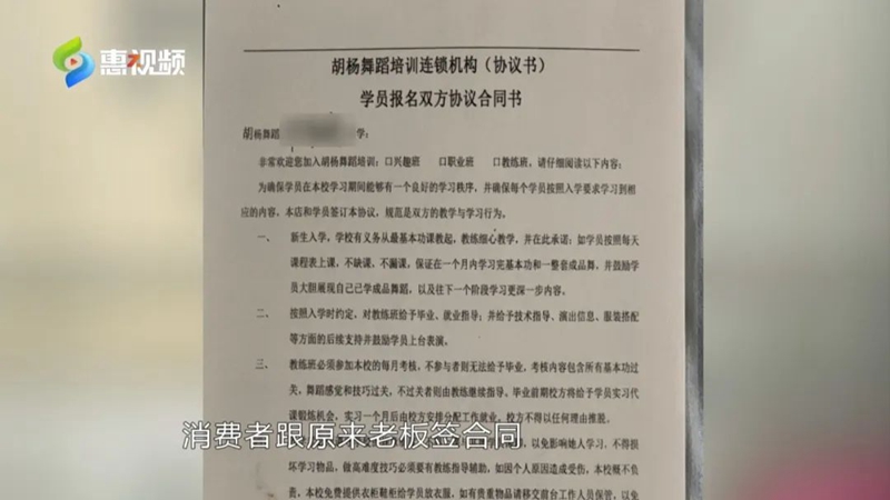 33歲的林女士,對(duì)舞蹈有著濃烈的興趣,想通過考證成為一名舞蹈老師。2022年6月24日,她在“胡楊舞蹈”博羅龍溪店支付了20520元/年的學(xué)費(fèi)后,進(jìn)入“至尊VIP教練班”學(xué)習(xí)。期間林女士搬家到了仲愷潼湖,今年3月,她把剩余課時(shí)從胡楊舞蹈龍溪店轉(zhuǎn)到了陳江店繼續(xù)學(xué)習(xí)。在臨近合同到期前一個(gè)月,也就是今年5月,胡楊舞蹈陳江店老板盧女士透露,有一個(gè)“終身學(xué)舞”的老學(xué)員福利活動(dòng)。