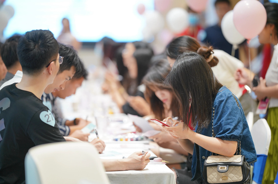 活動現(xiàn)場男女嘉賓填寫個人資料。