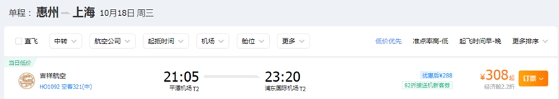 惠州飛往上海的機票價格低至308元