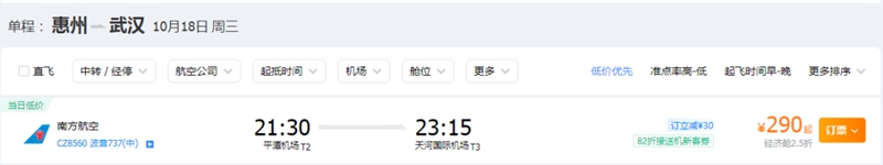 惠州飛往武漢機票價格最低為290元