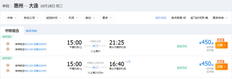 惠州飛往大連機票價格最低為450元