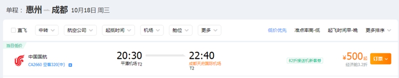 惠州飛往成都機票價格最低為500元