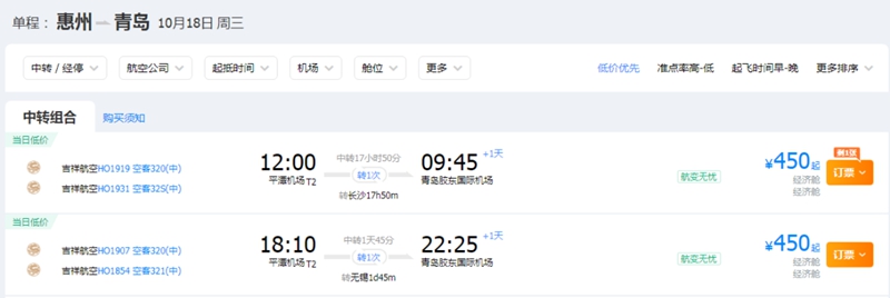 惠州飛往青島機票價格最低為450元
