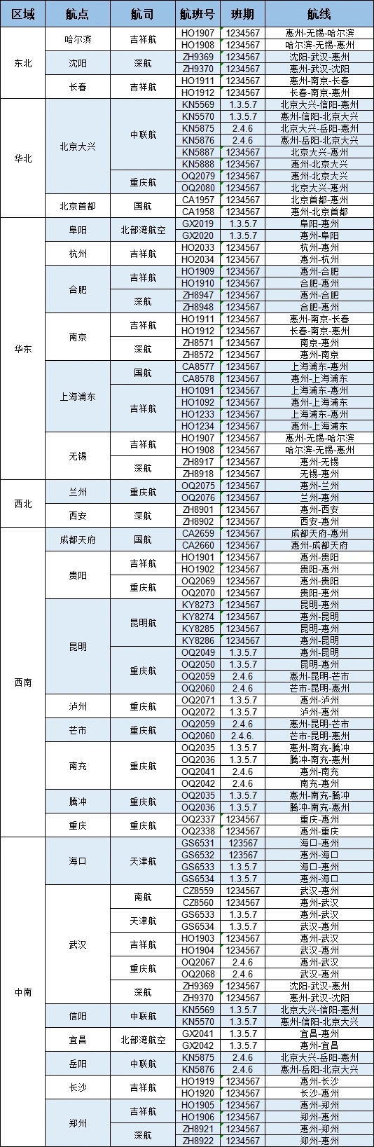 據(jù)悉,換季后,惠州機場將通航哈爾濱、沈陽、長春、北京首都、北京大興、阜陽、杭州、合肥、南京、上海浦東、無錫、蘭州、西安、成都天府、貴陽、昆明、瀘州、芒市、南充、騰沖、重慶、海口、武漢、信陽、宜昌、岳陽、長沙、鄭州等航點。同時,加密北京大興、昆明、南充、武漢等航點,并陸續(xù)新增阜陽、海口、芒市和騰沖等新航點。