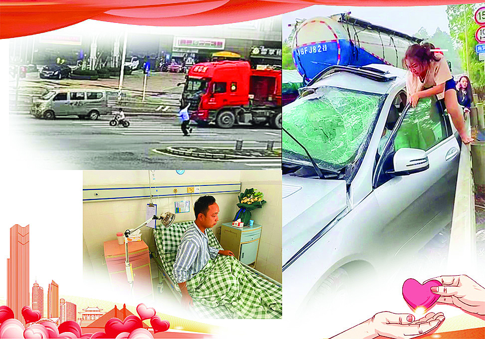 左上:車(chē)流中救下男童的“輔警哥”曾勇軍。 左下:擋刀救人的快遞小哥黎志偉。 右:車(chē)禍現(xiàn)場(chǎng)奮勇救人的“女俠”溫偉蓮。 惠州東江圖片社供圖