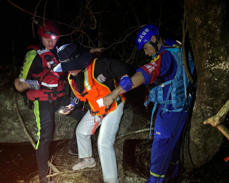經(jīng)過一番搜尋,救援組確定被困人員的位置。消防員攜帶救援裝備與派出所、村民協(xié)同救助,為被困人員依次穿戴好救生衣,并使用村民沖鋒舟分批來回轉(zhuǎn)移。救援上來后,救援組及時(shí)為被困人員提供飲用水、餅干,同時(shí)第一時(shí)間通知他們的家屬。經(jīng)過近2個(gè)小時(shí)的緊急救援,17名被困“驢友”被成功帶下山。
