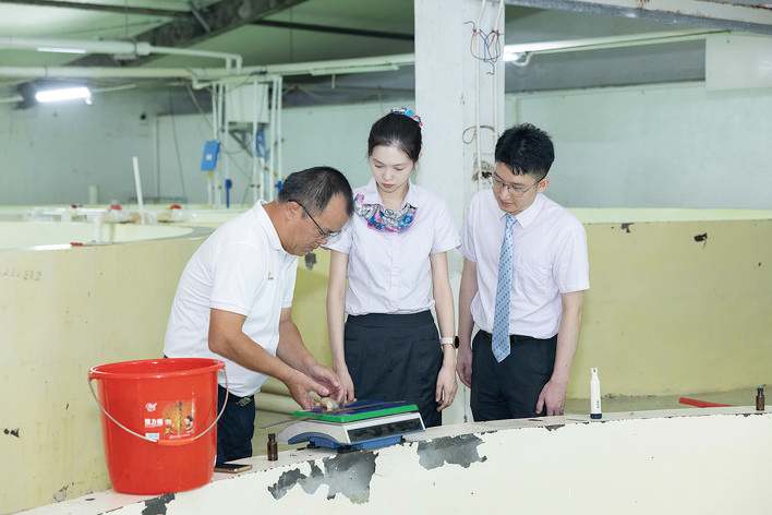 一方海水產(chǎn)種苗“兵工廠”內(nèi),顏闊秋正在測(cè)量魚的體重。