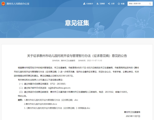 根據(jù)惠州市規(guī)范性文件的相關(guān)管理規(guī)定,市衛(wèi)生健康局、市教育局對(duì)8月17日-8月25日期間在市衛(wèi)生健康局、市教育局網(wǎng)站發(fā)布的《惠州市幼兒園托班開(kāi)設(shè)與管理暫行辦法(征求意見(jiàn)稿)》進(jìn)一步修改完善,現(xiàn)向社會(huì)最終征求意見(jiàn),歡迎社會(huì)公眾、專(zhuān)家學(xué)者、企事業(yè)單位、機(jī)關(guān)團(tuán)體等提出修改意見(jiàn)和建議。意見(jiàn)征集截止日期為2023年12月7日。