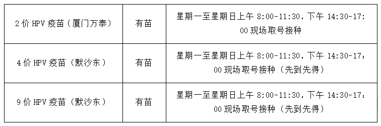 新一輪九價HPV疫苗已開放九價宮頸癌疫苗首針免預(yù)約接種(盧屋路接種點、人民六路接種點均有疫苗),無需預(yù)約,帶身份證即可接種。接種當(dāng)天工作時間均可在三樓自助取號。