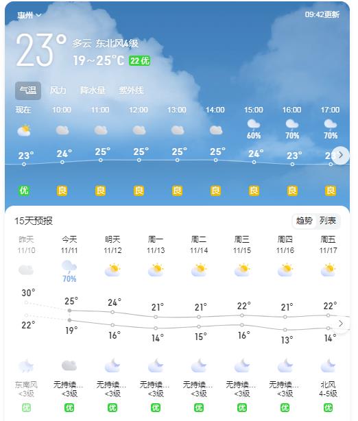 據(jù)市氣象臺(tái)預(yù)計(jì),11月11日,我市各地多云間陰天,21~26℃;11月12日,多云間陰天,18~25℃;11月13日,多云,16~23℃;11月14日,多云,15~22℃;11月15日,多云,白天氣溫回升,16~25℃;展望11月16~17日,受新一股冷空氣影響,北風(fēng)加大,氣溫再次下降。