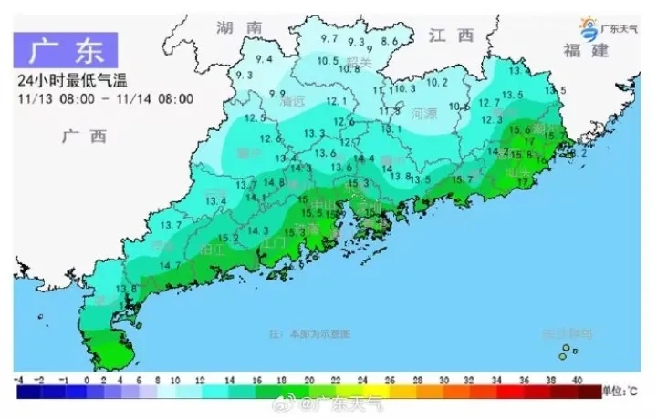 11月14日,受西路冷空氣補充影響,廣東迎今年下半年來最冷早晨,韶關(guān)、清遠(yuǎn)北部市縣最低氣溫跌破10℃,南雄低至8.6℃,廣州13.6℃,湛江14.3℃,深圳15.8℃,汕頭18℃。