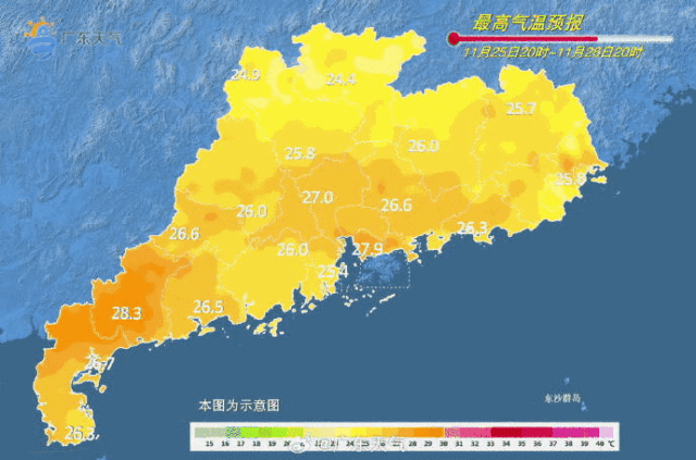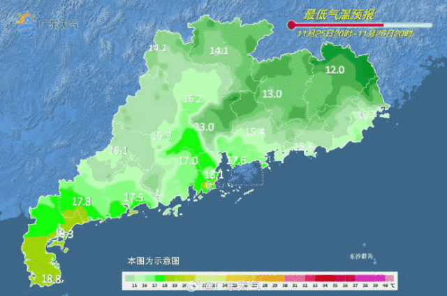 26日,廣東大部晴間少云。最低氣溫:粵北的北部市縣9℃~13℃,南部沿海市縣17℃~20℃,其余市縣14℃~17℃。