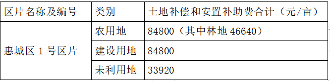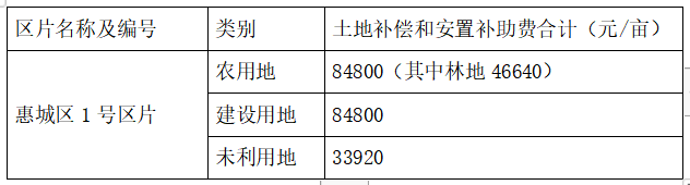 土地補(bǔ)償費(fèi)和安置補(bǔ)助費(fèi)按《惠州市人民政府關(guān)于公布實(shí)施征收農(nóng)用地區(qū)片綜合地價(jià)的公告》(惠府公〔2021〕4號(hào))規(guī)定的惠城區(qū)1號(hào)區(qū)片綜合地價(jià)標(biāo)準(zhǔn)執(zhí)行,其中全市統(tǒng)一設(shè)定林地調(diào)節(jié)系數(shù)0.55,征收建設(shè)用地參照征收農(nóng)用地區(qū)片綜合地價(jià)執(zhí)行,征收未利用地參照征收農(nóng)用地區(qū)片綜合地價(jià)設(shè)定調(diào)節(jié)系數(shù)0.4執(zhí)行。
