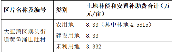 土地補(bǔ)償費(fèi)和安置補(bǔ)助費(fèi)按《惠州市人民政府關(guān)于公布實(shí)施征收農(nóng)用地區(qū)片綜合地價(jià)的公告》(惠府公〔2021〕4號(hào))規(guī)定的大亞灣區(qū)1號(hào)區(qū)片綜合地價(jià)標(biāo)準(zhǔn)執(zhí)行,其中全市統(tǒng)一設(shè)定林地調(diào)節(jié)系數(shù)0.55,征收建設(shè)用地參照征收農(nóng)用地區(qū)片綜合地價(jià)執(zhí)行,征收未利用地參照征收農(nóng)用地區(qū)片綜合地價(jià)設(shè)定調(diào)節(jié)系數(shù)0.4執(zhí)行。