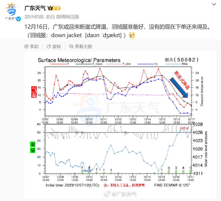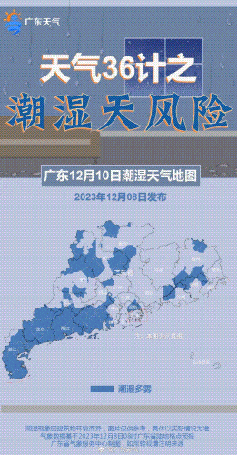 12月11日夜間~12日,廣東大部多云到陰天為主,伴有分散小雨,粵北天氣寒涼,其余地區(qū)降溫不明顯。