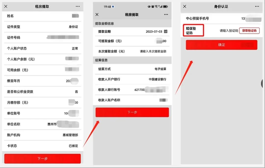 ②確認(rèn)個(gè)人公積金賬戶信息并點(diǎn)擊【下一步】按鈕;填寫本次提取金額(不能大于系統(tǒng)計(jì)算出來的可提取金額),確認(rèn)收款銀行賬戶信息并點(diǎn)擊【下一步】按鈕;在身份認(rèn)證頁(yè)面,點(diǎn)擊【獲取驗(yàn)證碼】按鈕并輸入收到的短信驗(yàn)證碼,最后點(diǎn)擊【確定】按鈕。