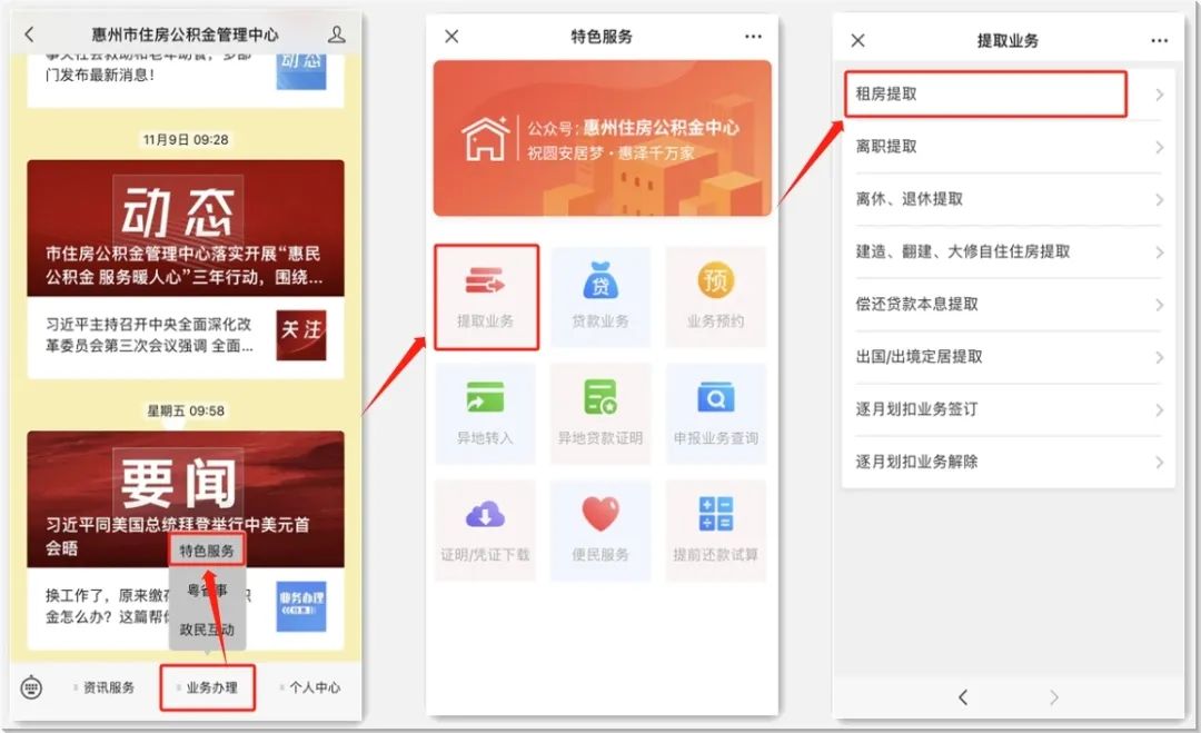 ①在“惠州市住房公積金管理中心公眾號(hào)”首頁(yè),依次點(diǎn)擊【業(yè)務(wù)辦理】-【特色服務(wù)】-【提取業(yè)務(wù)】-【租房提取】,進(jìn)入租房提取頁(yè)面: