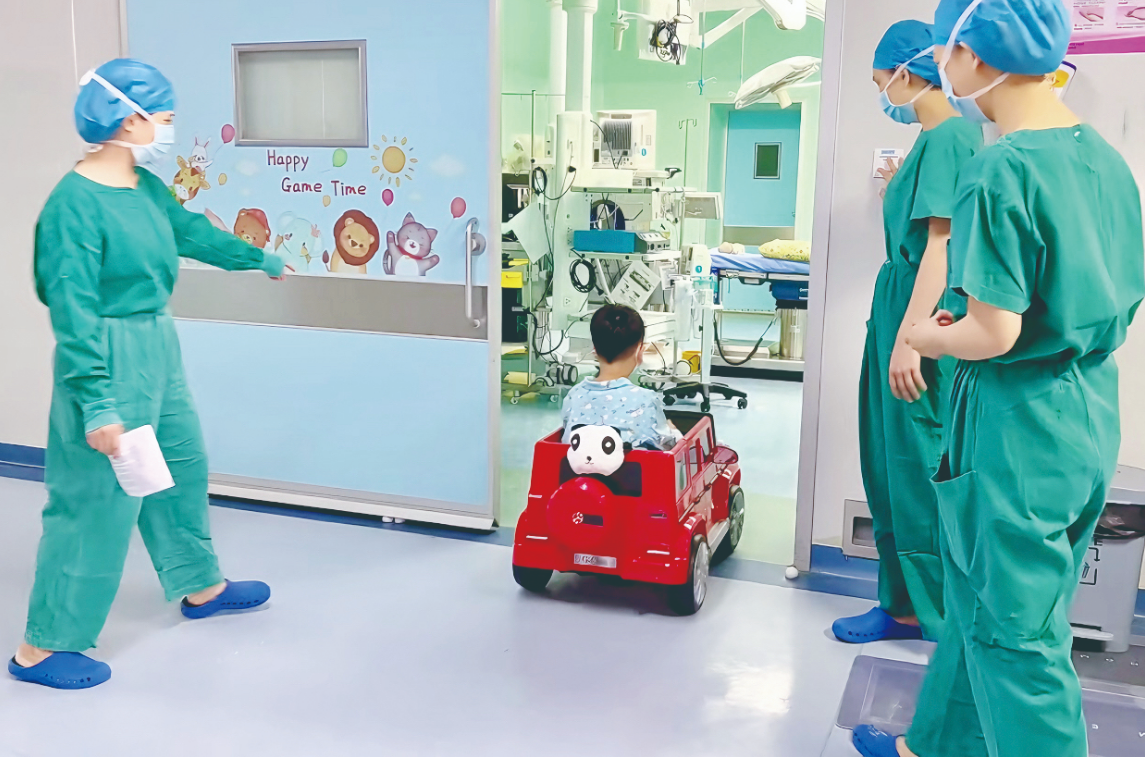 無哭聲手術(shù)室,患兒開著兒童電動車從術(shù)前準(zhǔn)備區(qū)進(jìn)入手術(shù)室。