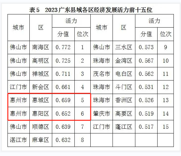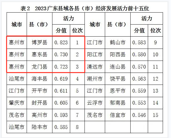 在縣(市)經(jīng)濟(jì)發(fā)展活力前15位中,珠三角僅占7席,低于粵東粵西粵北(8席)。其中,惠州占3席,博羅、惠東、龍門居前三;江門上榜3個,分別為開平、鶴山、恩平;肇慶入選1個,為封開。